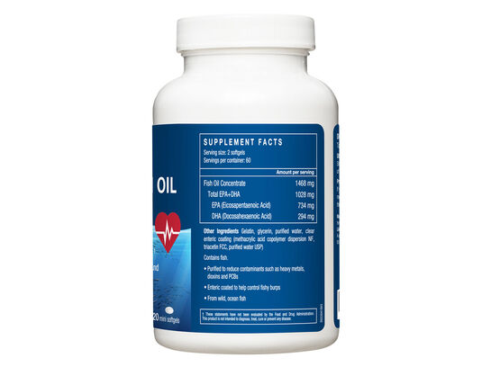 - 1468 มก. น้ำมันปลาเข้มข้นให้กรดไขมันโอเมก้า -3 1,028 มก.: 734mg EPA (กรด eicosapentaenoic) และ 294mg DHA (กรด docosahexaenoic) คุ้มค่าที่สุด (ความแรง) เมื่อเทียบกับผลิตภัณฑ์เสริมน้ำมันปลาทั่วไป