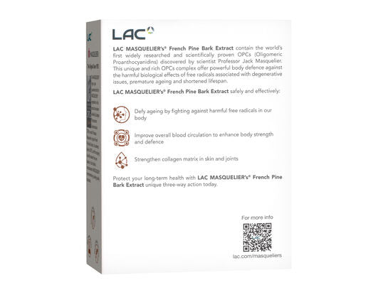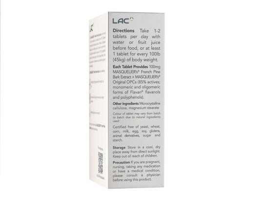 แต่ละแท็บเล็ตให้Masquelier's® French Pine Bark Extract + OPCS ดั้งเดิมของMasquelier's® (85% นักแสดง; รูปแบบโมโนเมอร์และ oligomeric ของฟลาโวนอลและโพลีฟีนอล)