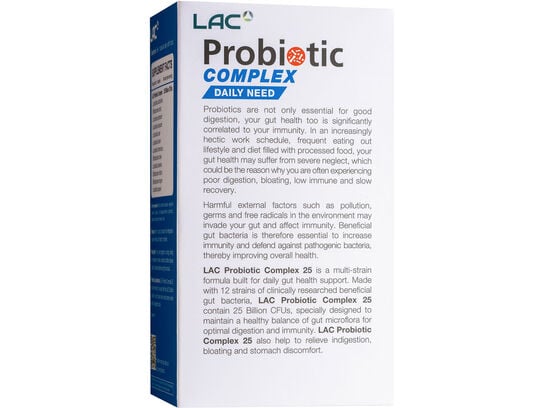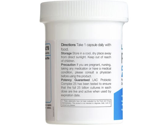 LAC โปรไบโอติกคอมเพล็กซ์ 25ได้รับการทดสอบเพื่อให้แน่ใจว่าไฟล์ วัฒนธรรมเต็ม 25 พันล้านในแต่ละปริมาณจะมีชีวิตและใช้งานเมื่อใช้โดยวันหมดอายุ