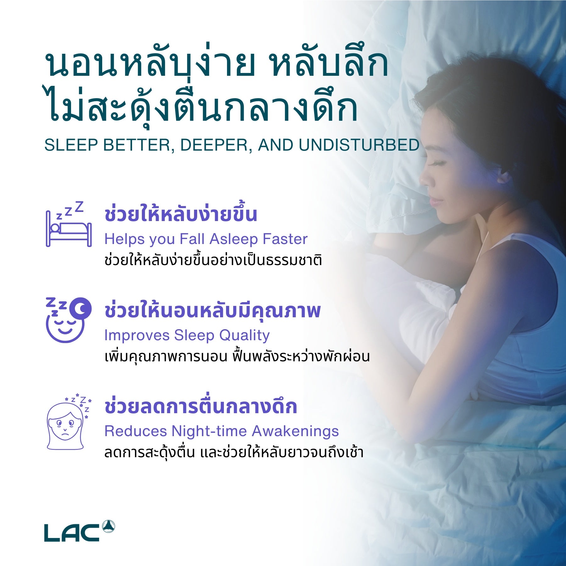 สูตรการนอนหลับของ LAC Triactionออกแบบมาเพื่อรองรับการผ่อนคลายและรูปแบบการนอนหลับของร่างกาย สูตรนี้ปล่อยสารอาหารสำคัญในระยะต่าง ๆ ของวงจรการนอนหลับของคุณช่วยสนับสนุนการนอนหลับตอนกลางคืนที่สงบและได้รับการบูรณะ นอกจากนี้ยังมีประโยชน์เมื่อปรับให้เข้ากับโซนเวลาใหม่หรือการเปลี่ยนแปลงในกิจวัตรประจำวันของคุณ