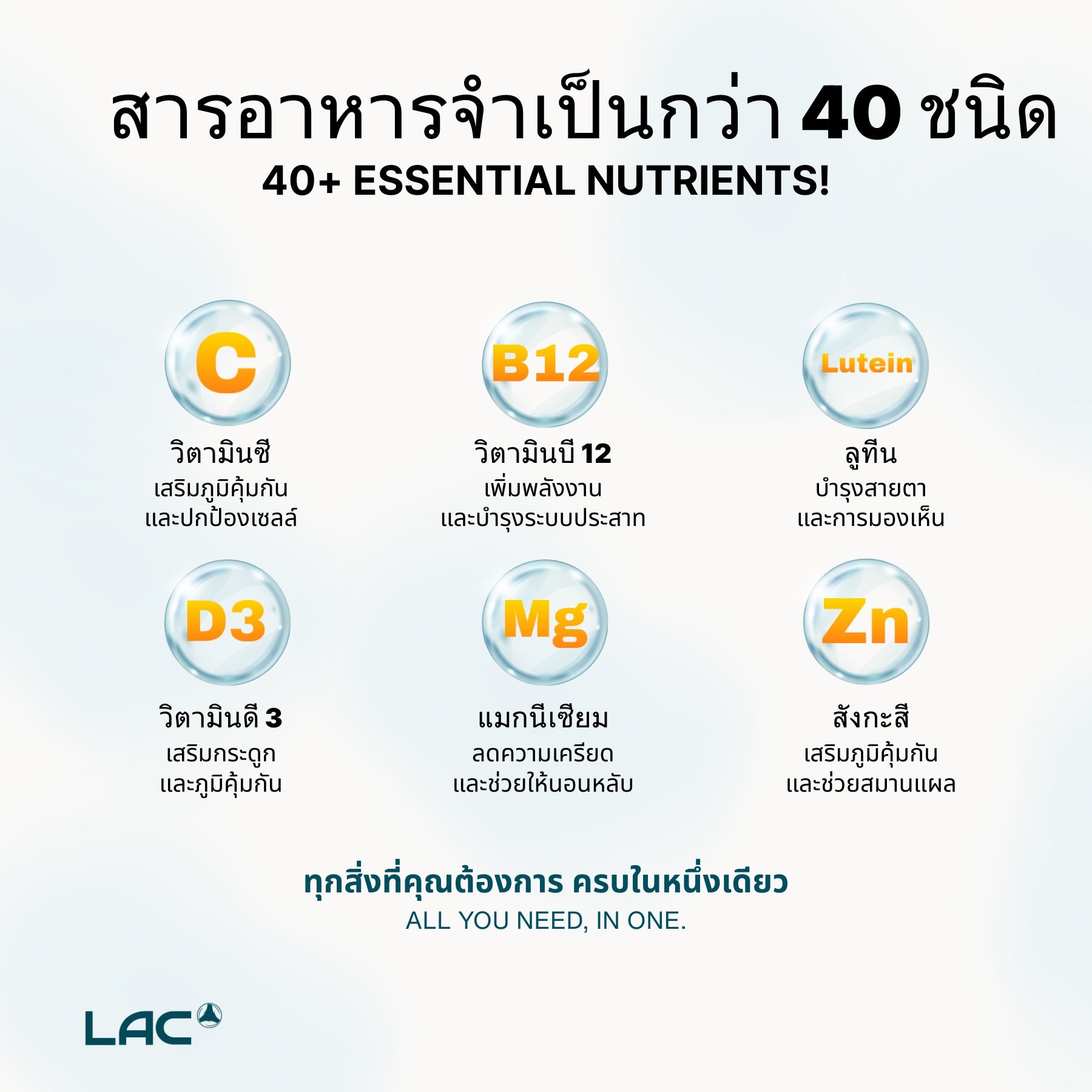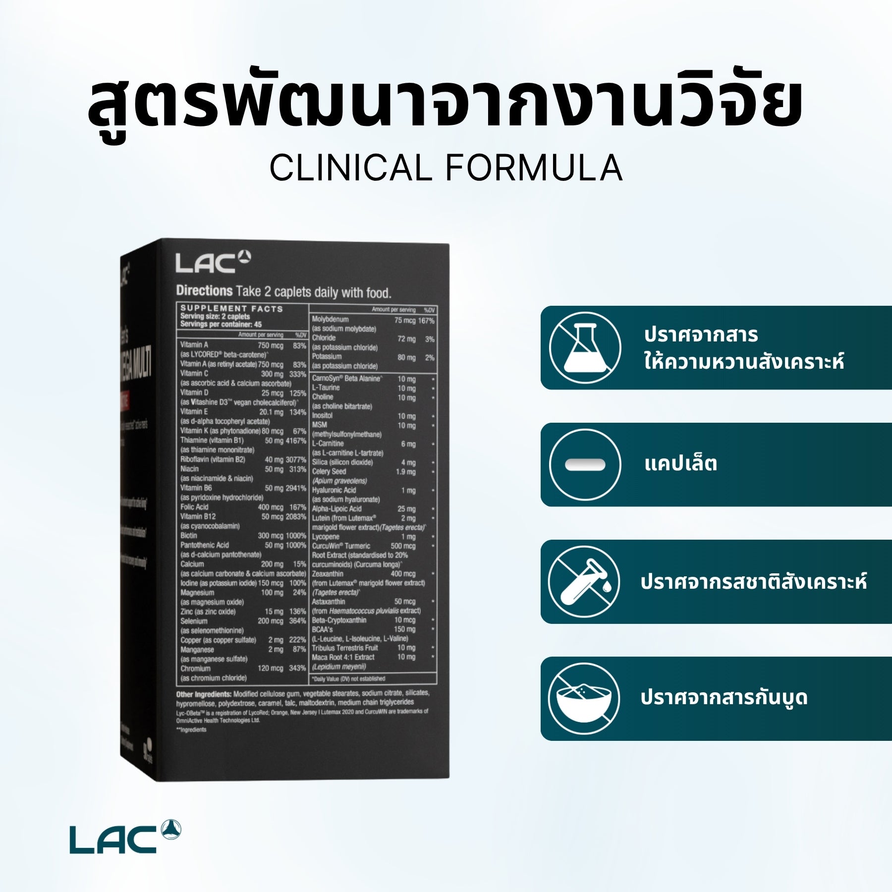 LAC Men’s Mega Multi Active เป็นสูตรที่ครอบคลุมซึ่งออกแบบมาเพื่อสนับสนุนผู้ชายที่กระตือรือร้น ประกอบด้วยวิตามิน แร่ธาตุ และสารอาหารที่ได้รับการวิจัยทางคลินิกมากกว่า 40 ชนิดเพื่อประสิทธิภาพที่ดีขึ้น การทำงานของกล้ามเนื้อและสารต้านอนุมูลอิสระ สูตรปลดปล่อยตามเวลาเฉพาะตัวช่วยให้ดูดซึมสารอาหารได้อย่างค่อยเป็นค่อยไปตลอดทั้งวัน