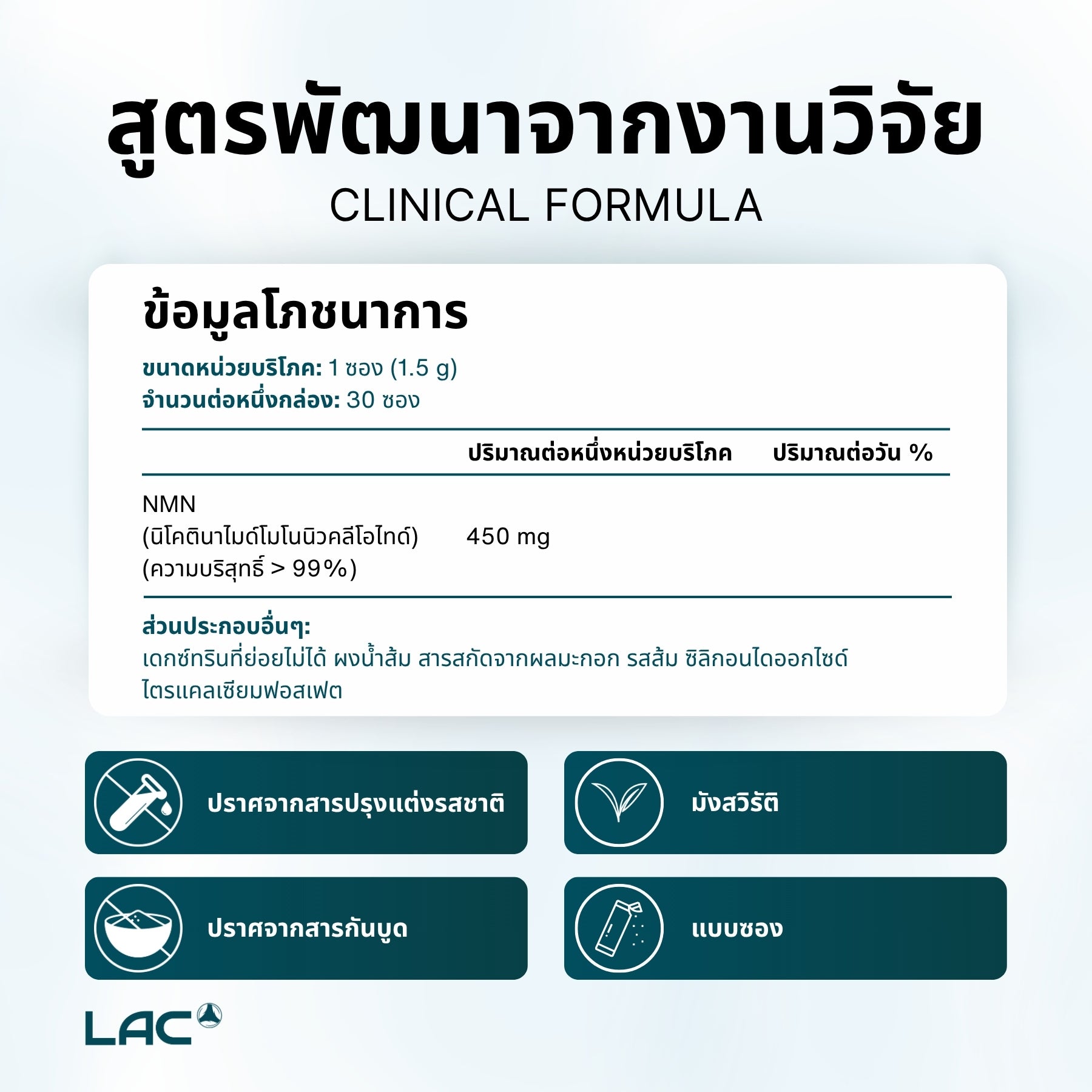 Lac NMN คืนค่า NAD+ (nicotinamide adenine dinucleotide) ให้อยู่ในระดับสูงสุดทำให้เกิดผลกระทบอย่างรุนแรงของเซลล์อายุในร่างกายของคุณ แต่ละซองมีขนาดสูง 450 มก. NMN (> ความบริสุทธิ์ 99%), ซึ่งมีบทบาทสำคัญใน